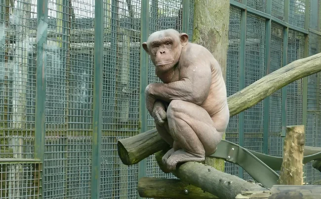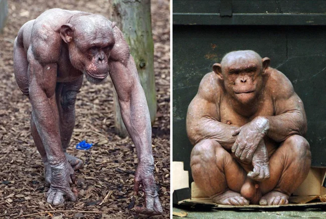 Один из немногих видов, у которых облысение не оказывает сильного влияния на выживаемость — шимпанзе, наш ближайший родственник! Он живёт в тепле, не нуждается в защите от мелких травм и ссадин, потому и шерсть для него — штука необязательная. Облысевшие самцы и самки принимаются в обезьяньи группы на общих правах, на равных со всеми участвуют в борьбе за власть и могут даже стать альфами! Так произошло с приматами Джамбо и Монго в зоопарке Англии.