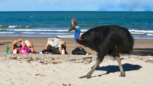 Как видите, люди не разбегаются от страха при виде казуара. Они спокойно читают и загорают! Если бы на пляж выбежал лев, думаю, реакция была бы совсем другой.
