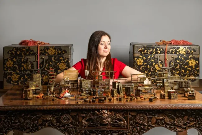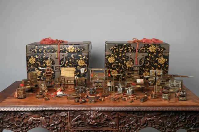 В комплект входят разнообразные предметы мебели, включая сундуки, полки и шкафчики, а также миниатюрные книги с каллиграфическими надписями, бумажные фонарики, письменные столы, туалетный набор и даже паланкин с бамбуковыми жалюзи. По оценкам специалистов, этот набор датируется XIX веком, что делает его особенно ценным.