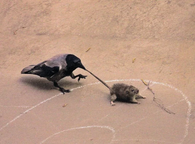 Бывает и такое, что птицы целенаправленно кого-то троллят. Чаще всего, под прицел приколистов попадают соседи по каменным джунглям: кошки, собаки, крысы, другие птицы. Каркуши то за хвост кого-то дернут, то за ухо цапнут, то за попу ущипнут. Конечно, такое поведение не всегда игровое. Назойливыми приставаниями птицы отвлекают конкурента от еды, защищают гнездо или птенца-слетка. Но бывает и такое, что видимых причин нет, а тычки исподтишка — есть.