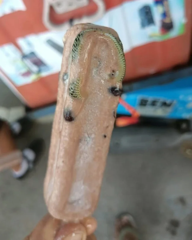 Рейбан Накленгбун купил угощение в ларьке на улице, а когда развернул, заметил вмерзшую в него рептилию. Мужчина поделился фотографиями своего десерта в соцсетях.