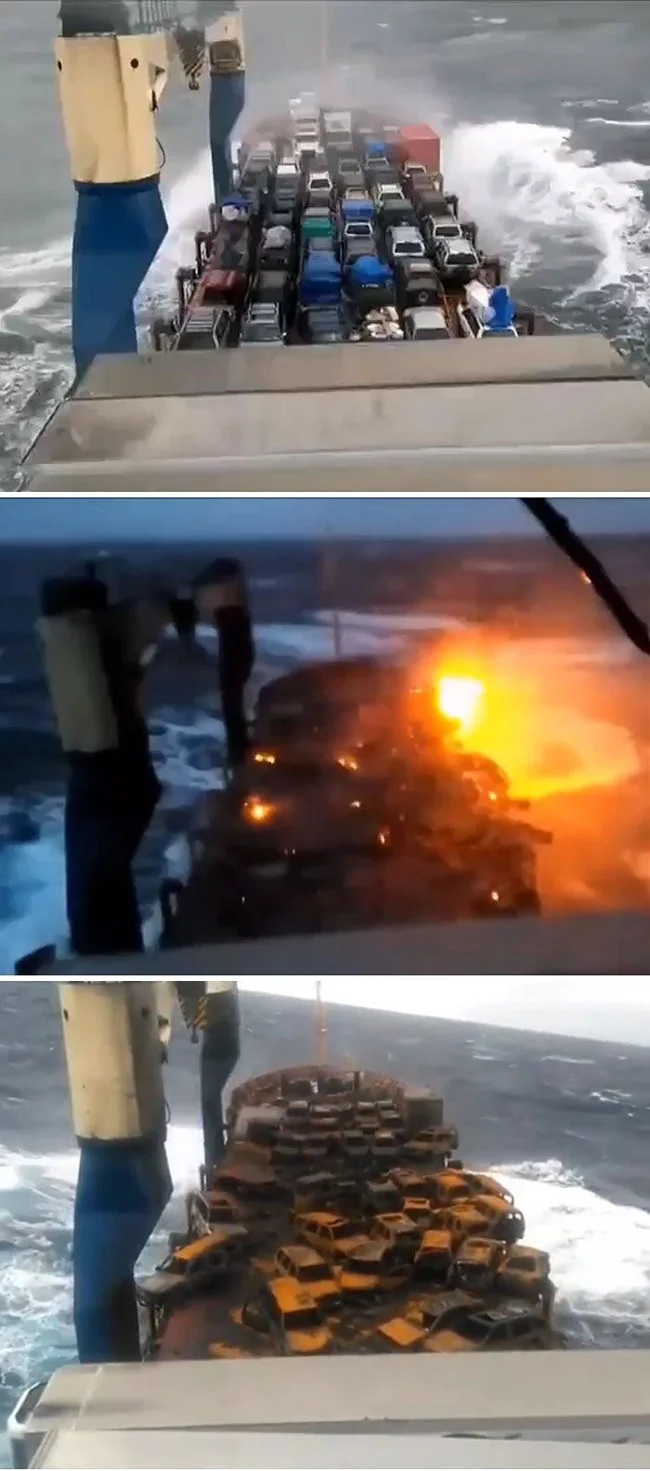6. Автомобили, перевозимые на открытой платформе, загораются после того, как соленая вода закоротила батареи
