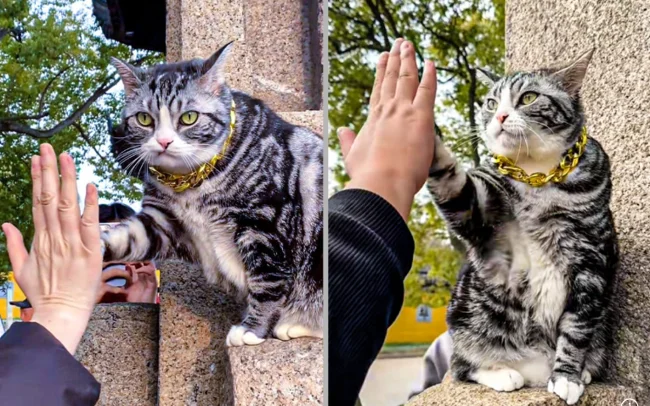 Дружелюбную кошку в храме Сиюань в Сучжоу окрестили «кошкой-дай-пять» из-за того, как она поднимает лапу, чтобы поприветствовать посетителей.