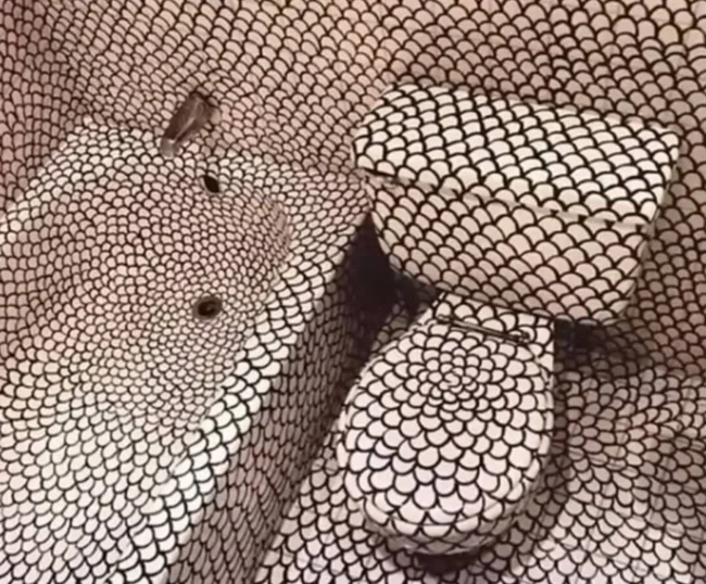 Эта плитка вызывает настоящий ужас – вся комната, включая унитаз и стены, покрыта узором, напоминающим змеиную кожу. Какой эффект? Постоянное ощущение, что за тобой наблюдают, от этого легко можно сойти с ума.