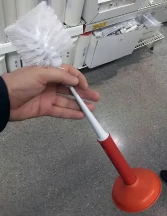 Два в одном – это удобно. Но ёршик и вантуз на одной палке? Удачи не перепутать стороны! Дизайнер явно хотел поиздеваться над людьми, которые любят чистоту.