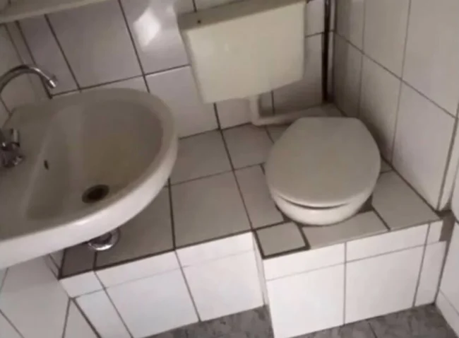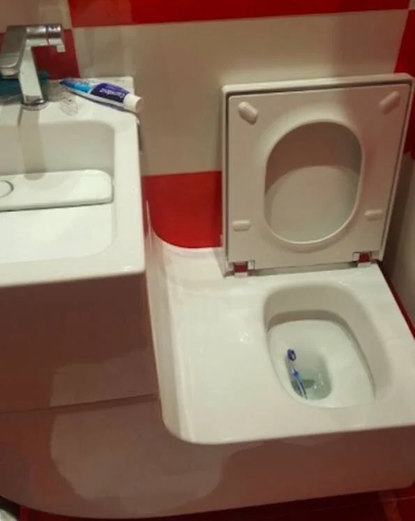 Сочетание раковины и унитаза так, чтобы всё стекающее вниз летело прямо в унитаз. Это экономия пространства или спланированная катастрофа? Но я думаю, что второе. Не зря там уже отдыхает зубная щётка