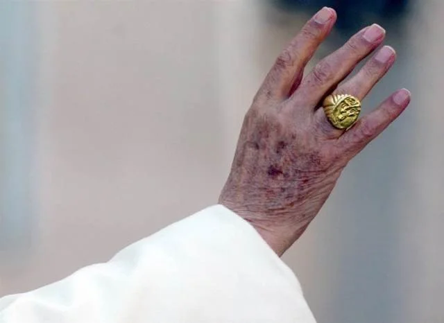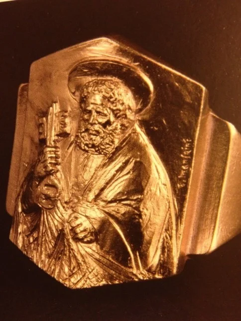Папский перстень, призванный напоминать о том, что понтифик является наследником апостола Петра, который был рыбаком. На нем изображен сам апостол. После смерти папы кольцо уничтожается Камерленго. Кольцо плющится с помощью молотка, а потом расплавляется.
