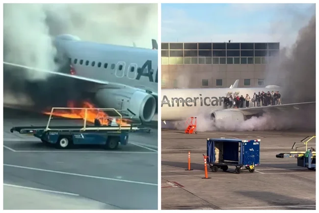Пассажиры загоревшегося в США самолёта ожидали спасения, стоя на его крыле (1 фото + 3 видео)