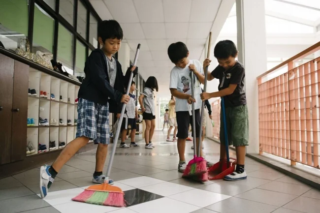 В большинстве японских школ нет уборщиков. Вместо них уборкой ежедневно занимаются дети, что является частью практики, уходящей корнями в буддийские традиции, которые связывают уборку с ответственностью, самостоятельностью и нравственностью.