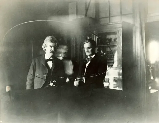 Марк Твен и Никола Тесла были лучшими друзьями и увлекались электричеством. Познакомились в 1889 году в Нью-Йоркском клубе джентльменов. Именно Твен поддержал начинающего исследователя в исследованиях электричества.