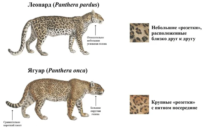 Ягуар настолько не хочет выделяться, что его часто путают с другим пятнистым котиком — леопардом! На этой схеме отлично видно, насколько ягуары мощнее и развитее своих ближайших родичей.