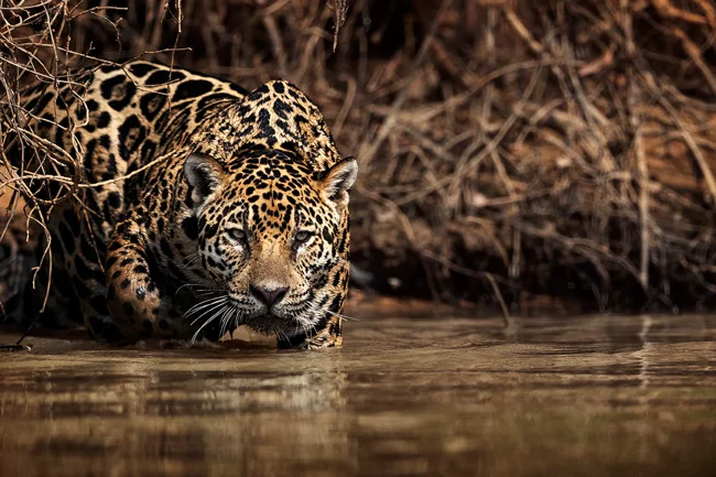 Ягуар не стремится выделиться понтами и вычурностью. Да, пятнистая шуба может показаться вульгарно-яркой, но это лишь на наш, человеческий взгляд. В глазах добычи хищник остается призраком смерти: травоядные не видят разницу между оранжевым и зеленым — у них нет колбочек, восприимчивых к красному цвету.