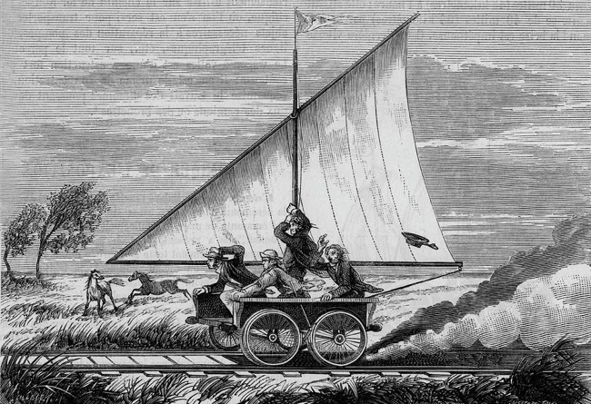 Прежде чем перейти к окончательному варианту, железная дорога экспериментировала с другим источником энергии - ветром. 19 марта 1830 года первый вагон с парусом, в котором ехало около 15 пассажиров, развил скорость до 25 километров в час. Ветер был настолько сильным, что мачту снесло за борт.