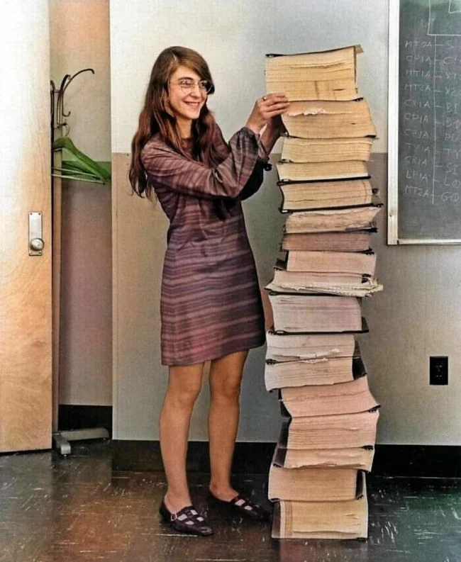 7. Это Маргарет Гамильтон - учёная в сфере информатики. Она стоит рядом с кодом, который она создала для программного обеспечения американской космической программы НАСА «Аполлон»