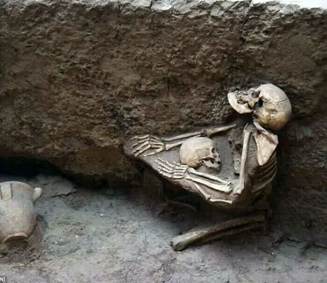 2. 4000-летние скелеты матери и ребёнка, которая пыталась его защитить от сильного землетрясения. Катастрофа случилась в Китае в 2000 году до нашей эры и вызвала сильное наводнение. Это событие называют “Китайскими Помпеями”
