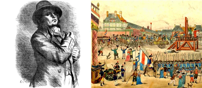 Слева: портрет Шарля-Анри Сансона, написанный Э. Лампсонием в романе Бальзака «Эпизод из времён террора». Справа: Сансон гильотирует Робеспьера 28 июля 1794 года.