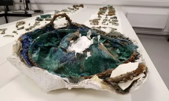 Результаты начального анализа клада, опубликованные во вторник, свидетельствуют о том, что многие предметы были специально сожжены или сломаны перед захоронением — видимо, в знак демонстрации власти и богатства.