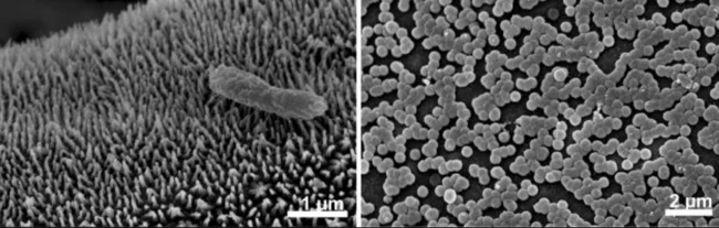 Микроструктуры двух разных видов цистисом. Слева вы видите, как на них, словно на коврике, вольготно разлеглась бактерия.