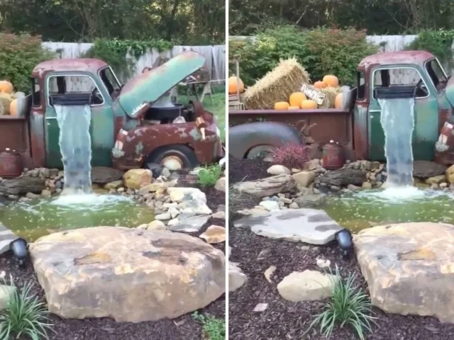 Старый грузовик теперь используется как садовый водопад