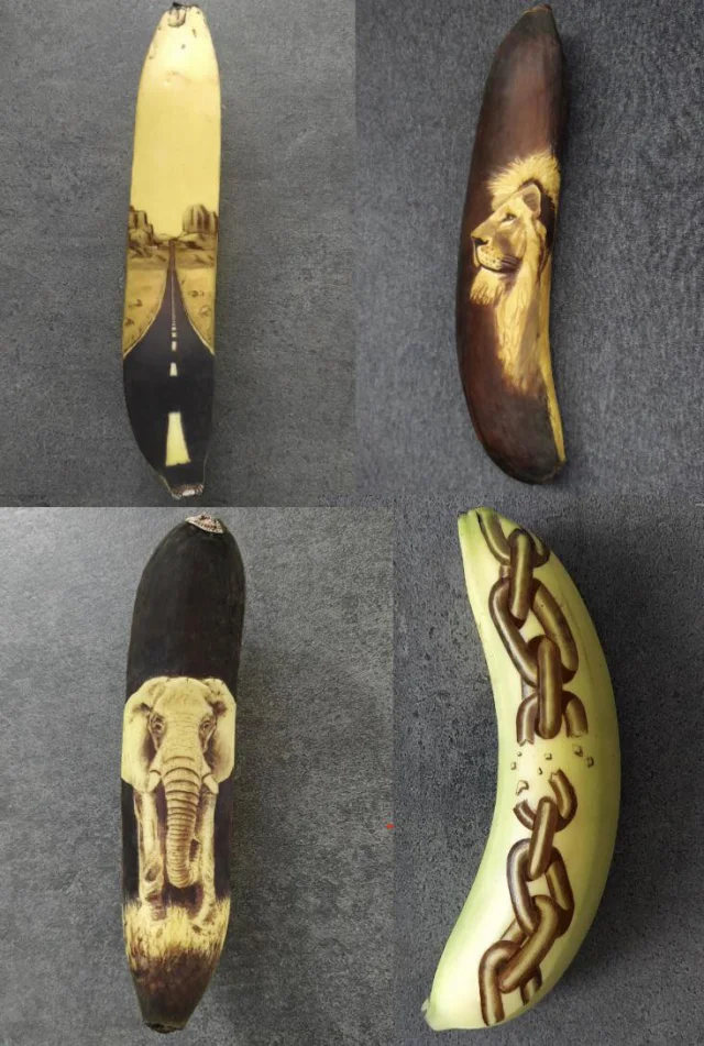 Рисунки на подпортившимся банане, сделанные с помощью булавки и расчёски