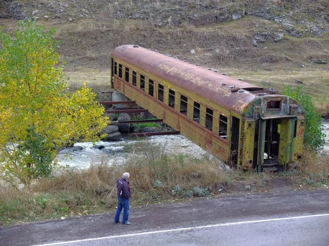 Мост из старого железнодорожного вагона через реку в горах Южной Георгии ![]()