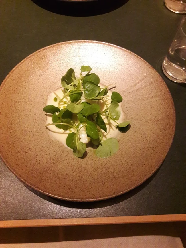 Так вот…Столик довольно маленького размера, почти квадратный, на краю столика есть встроенная емкость для столовых приборов, которых там было как минимум по 12 наборов (т.е. нож, вилка, ложка).Официант принес меню. Фишка этого ресторана, как кстати я читал и многих мишленовских, в том, что меню разбито на так называемые сеты. То есть ты не можешь выборочно заказывать разные блюда из меню, а тебе предлагается уже готовый, составленный шеф-поваром набор из 3,4,5…и более блюд. Мы выбрали сет из 6 блюд без алкоголя. С алкоголем в 2 раза дороже выходило примерно.