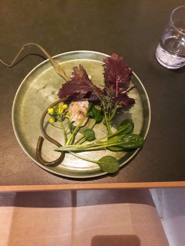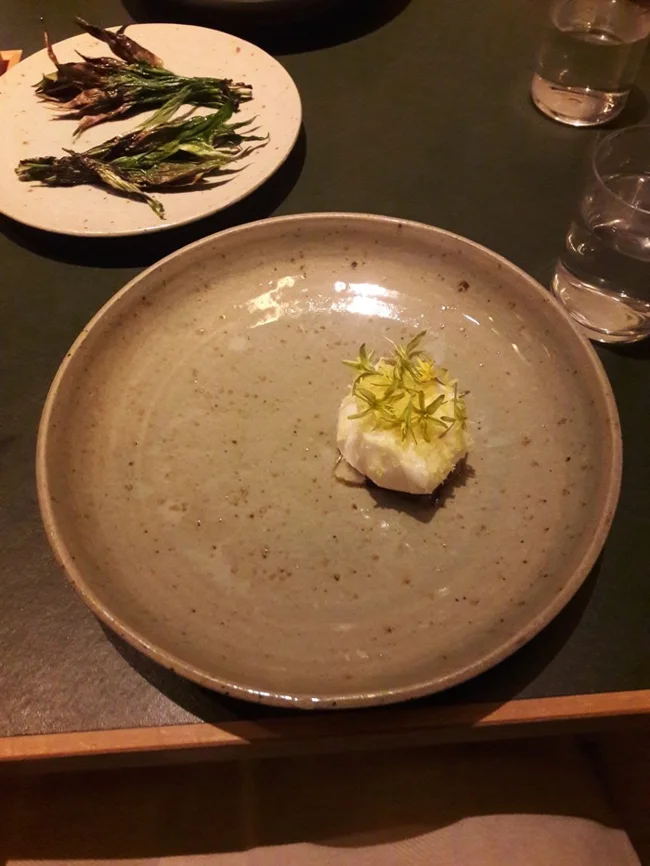 Яйцо пашот. Сказали, что гусиное. Никогда не ел. Вкусно кстати, но маловато. Трава была зажарена на огне, что за трава, забыл, да и не помнил особо, съел все, даже цветочки.