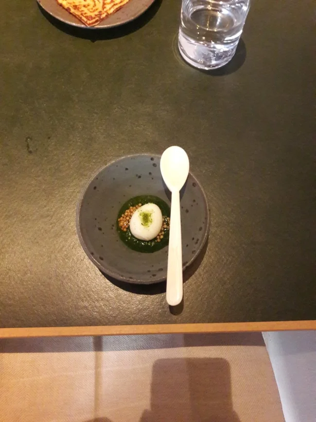 Насколько я помню, это перепелиное яйцо в каком-то соусе зеленом и с горчицей. Яйцо было всмятку, вкусное…соус съел тоже…что-то с водорослями. А, да! К нему еще были какие-то тоненькие лепешки на огне. По одной. Похрустели. Пофоткали.