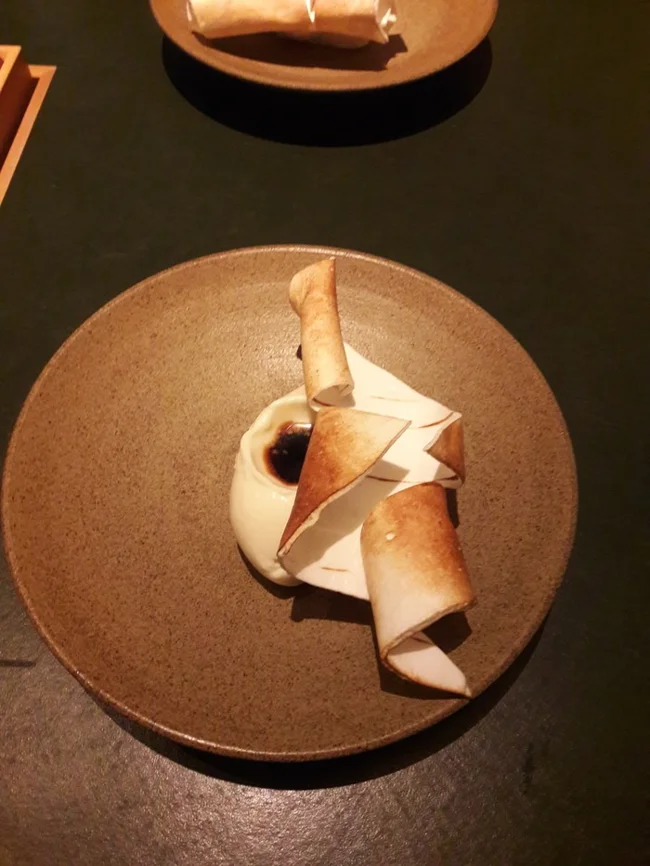 Мороженое, похожее на фруктовый лед. Сверху что — то вроде суфле … не помню, как это называется точно. В середине соус, похож был вообще на соевый. Довольно необычное сочетание.