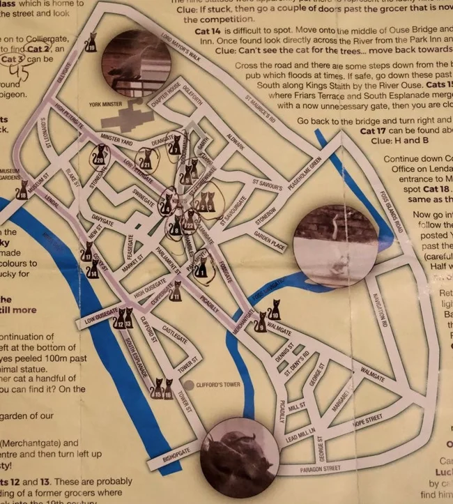 Кошачьи статуи Йорка сосредоточены в центре и восседают на карнизах, крышах и трубах по всему городу. Первоначально пара металлических котов появилась примерно на рубеже веков, и считается (хотя это, скорее всего, апокриф), что они были созданы для отпугивания крыс от близлежащей реки.