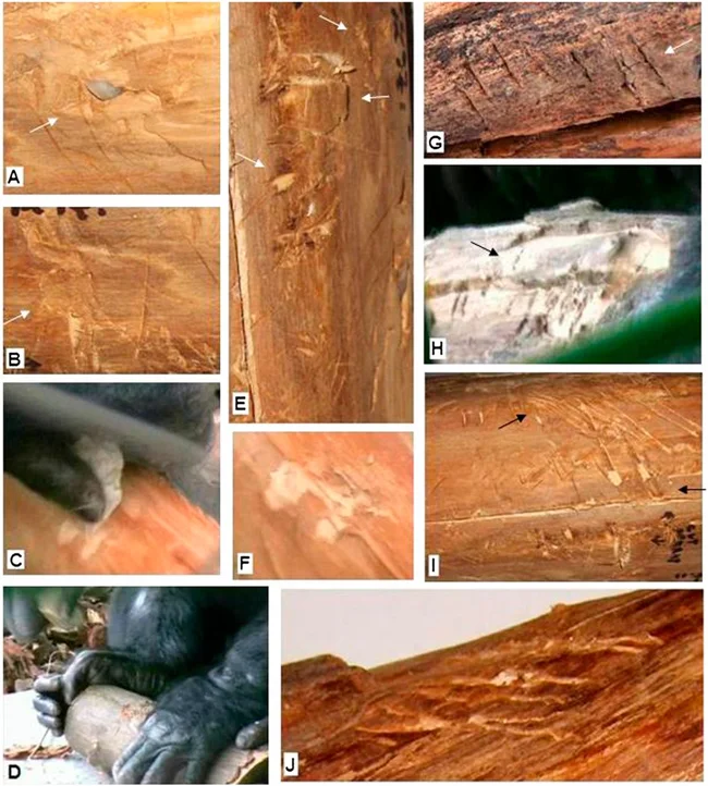 Это не просто странные порезы, а следы деятельности приматов. Шимпанзе рубили, вдавливали и вкручивали орудия труда, которые у них получались, чтобы добраться до вкусностей, которые прятали эксперементаторы.