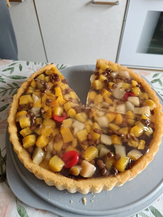 Этот торт мне сегодня подала бабушка. Это консервированные фрукты, желатин и шоколадные капли на бисквите. Рецепт из кулинарной книги 60-х годов. В следующий раз она, видимо, приготовит запеканку с тунцом в микроволновке.