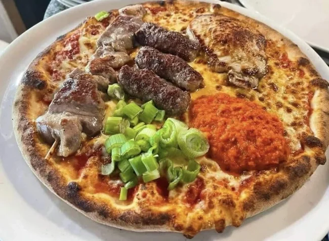 Пицца со свиной шеей, колбасками чевапи, зелёным луком и овощной икрой.