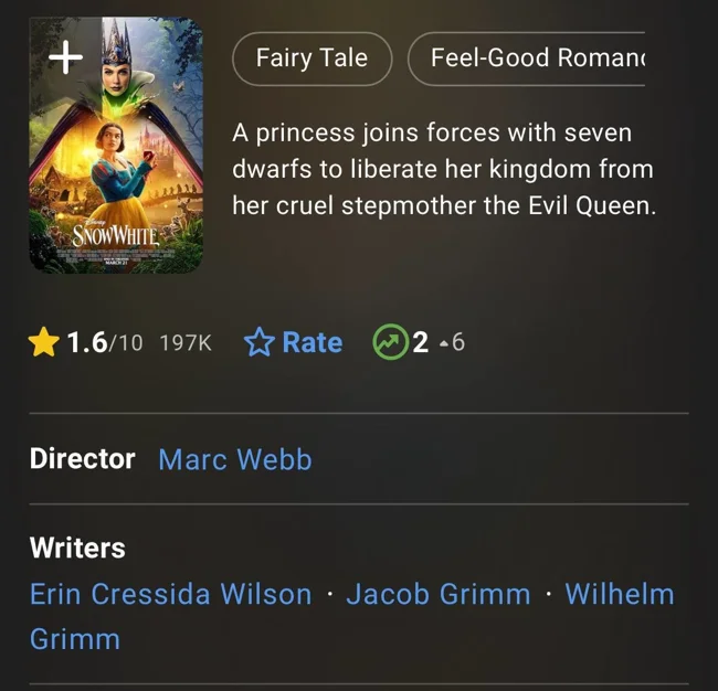 На производства ремейка "Белоснежки" потратили $250 млн, тогда как кассовые сборы составили всего $87 млн. Зрители поставили картине рекордно низкие оценки. Почти 200 тысяч посмотревших "шедевр кинематографии" оценили его на 1,6 баллов из 10 возможных.
