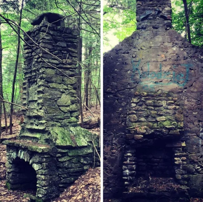 Это заброшенная усадьба в лесу. Ярко рисуется, как сюда приходят любители приключений и старины. Время безжалостно разрушает даже кирпичную кладку