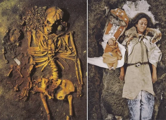 Рядом с её головой лежали 200 зубов благородного оленя, а ребёнок лежал на лебедином крыле с ножом у бедра. Считается, что женщина умерла во время родов.