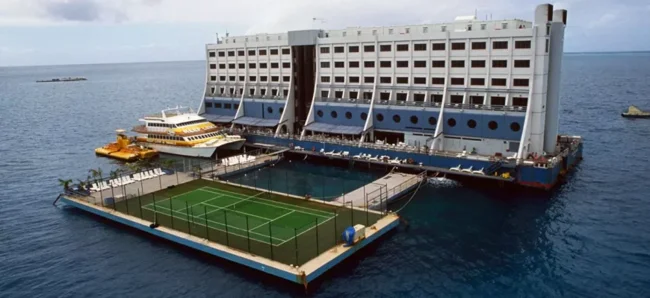 Так в 1988 году внутри подковообразного рифа в 80 километрах от побережья возник плавучий красавец-отель. Его появлению предшествовало два года постройки на верфях Сингапура, что обошлось в 45 миллионов долларов (100 млн по нынешним деньгам с учетом инфляции). И это был не просто великолепный отель, но еще и чудо инженерной мысли.