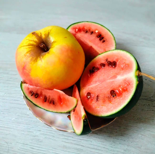 То ли яблоки огромные, то ли арбуз не уродился. Есть версии?