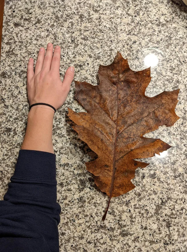 Рука взрослого человека против листа возрастного дуба, который растет во дворе