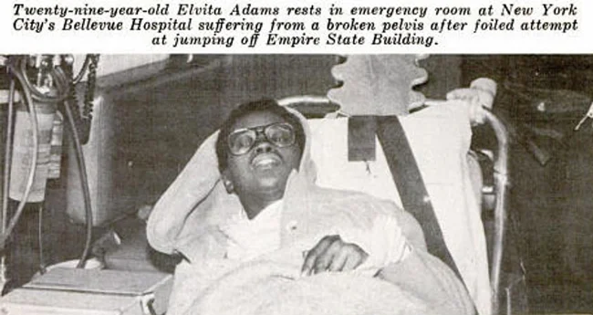 В 1979 году Эльвита Адамс спрыгнула с 86-го этажа Эмпайр-стейт-билдинг в попытке самоубийства из-за навалившихся жизненных неурядиц, но порывом ветра её снесло обратно на 85-ый этаж. Единственной её травмой стал перелом бедра.