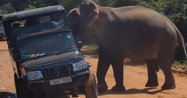 В национальном парке Яла на Шри-Ланке слон напал на внедорожник. Животное пыталось схватить пассажиров и чуть не опрокинуло машину.