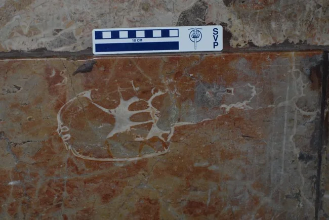 Некоторые палеонтологи считают, что окаменелости принадлежат не динозавру: это поперечный срез аммонита - вымершего вида моллюска, который довольно часто встречается в окаменелостях.