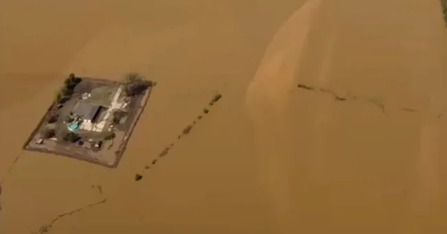 Американский штат Теннесси буквально ушёл под воду. Ливни затопили всё вокруг, но участок семьи Хамфри остался нетронутым. На видео с воздуха единственный дом в Риджли стоит посреди зоны бедствия.