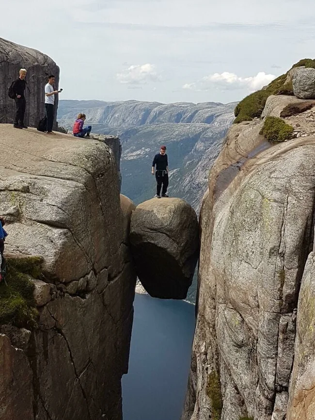 Норвегия, камень Кьераг. Автор фото стоит, точнее, балансирует на валуне, застрявшем между двумя скалами. Под ним — километр свободного падения. Комментарий: «Если бы оступился, умер бы. Но не оступился». Надеюсь, у него был хороший день после этого.