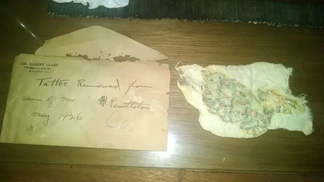 7. «Я обнаружил это в старом доме моих друзей. Настоящая татуировка, которую удалили с руки мужчины в 1926 году. Её поместили на марлю»