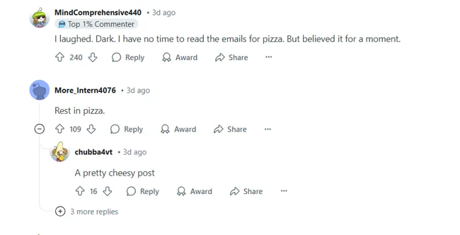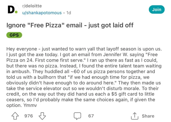 60 человек эту наживку заглотили и бегом бросились за заветной халявой. Вот только вместо бесплатного угощения их поджидал коварный отдел HR с уведомлением об увольнении. Мол, раз у вас во время рабочего дня есть «лишнее время» на подобную глупость, то милости просим с вещами на выход. На прощание каждому выдали купон на $5 в пиццерию.