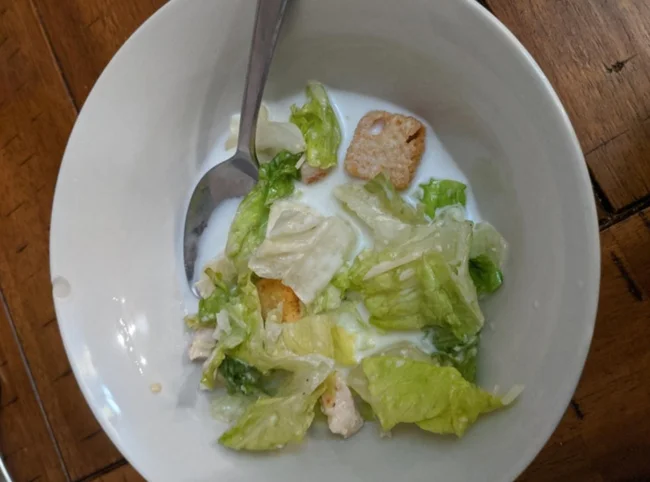Молоко, курица и листья салата. Слабо угадать рецепт? Оказывается, это салат «Цезарь» в исполнении 3-летнего будущего повара. ![]()