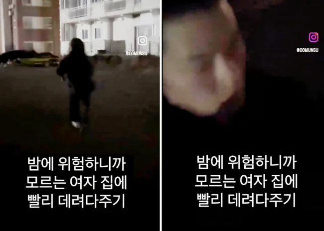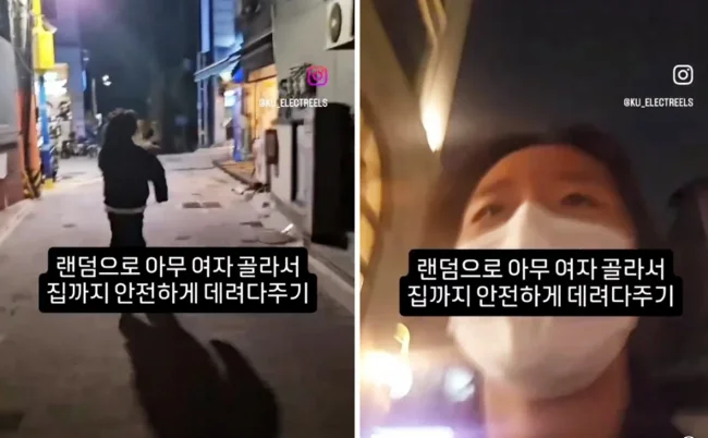 Видео под названием «Выбор случайной женщины и помощь ей в безопасном возвращении домой» показывало, как женщина убегает от «помощника» в явном страхе, не оглядываясь. Когда оно стало вирусным, внезапно оказалось, что таких роликов в сети довольно много. Студенты из Национального университета Чунгбук и Национального университета Ханбат также опубликовали видео с похожими подписями на прошлой неделе. Там несколько студентов сняли, как преследовали студентку по пустой улице ночью.