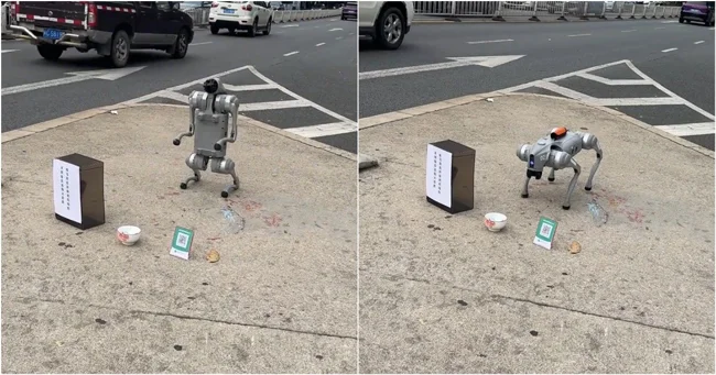 Какой-то очень находчивый китаец оставил робопса попрошайничать на улице в провинции Фуцзянь. QR-код и миска для наличных прилагаются. Мы на такой киберпанк 2077 не подписывались.