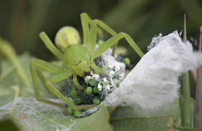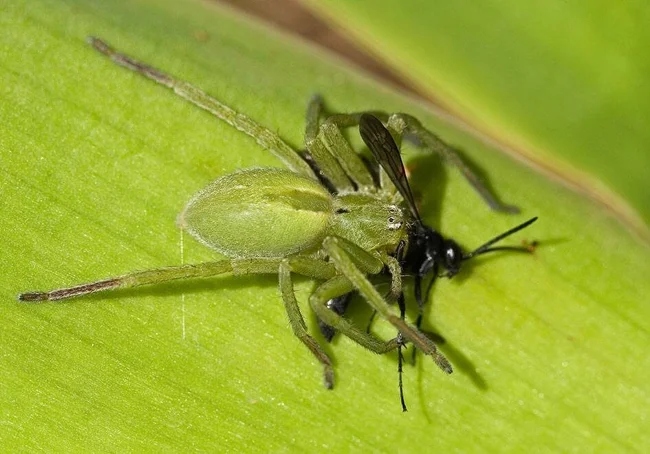 Зелёный пигмент маскирует отлично. Микромата спокойно охотится в разгар дня. Другие пауки не могут себе это позволить, так как их легко обнаружат птицы.